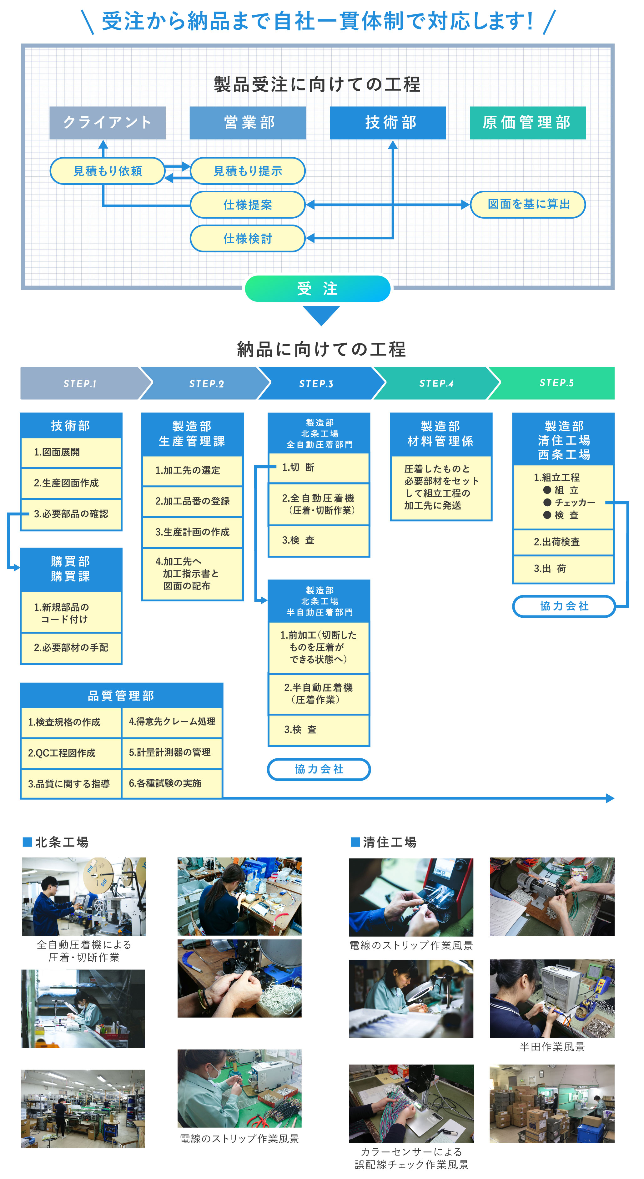 ●圧着加工 ●圧接加工 ●ケーブル加工 ●半田加工 ●収縮加工 ●ツイスト加工 ●アッセンブリー